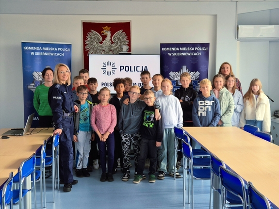 16 października Komendę Miejską Policji w Skierniewicach odwiedzili uczniowie ze Szkoły Podstawowej nr 4 w Skierniewicach oraz Szkoły Podstawowej w Dąbrowicach. Spotkanie poprowadziła policyjny profilaktyk – aspirant Katarzyna Kurkowska. Na początku dzieci wspólnie przypomniały sobie podstawowe zasady wzywania pomocy, w tym schemat rozmowy z dyspozytorem numeru alarmowego 112. Uczniowie poznali tajniki pracy policjantów, przypomnieli sobie zasady wzywania pomocy oraz wzięli udział w prelekcji profilaktycznej.