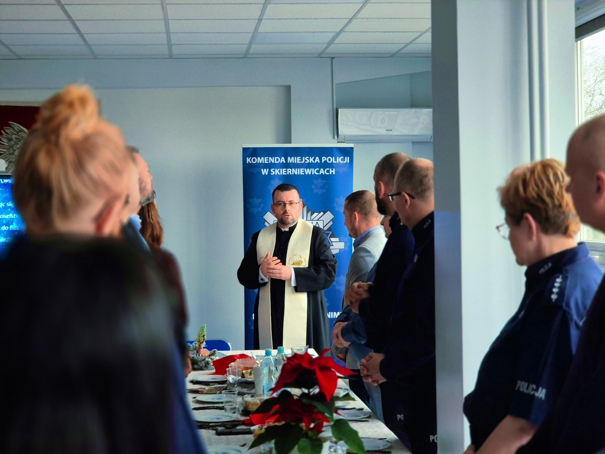 W piątek, 12 grudnia 2025 roku w Komendzie Miejskiej Policji w Skierniewicach odbyło się tradycyjne spotkanie wigilijne, w którym wzięli udział funkcjonariusze Policji, pracownicy cywilni oraz ksiądz Szymon Smółka.